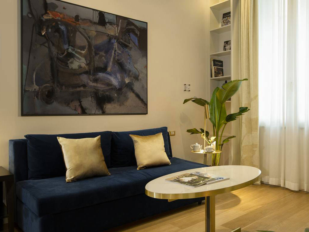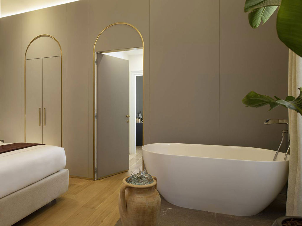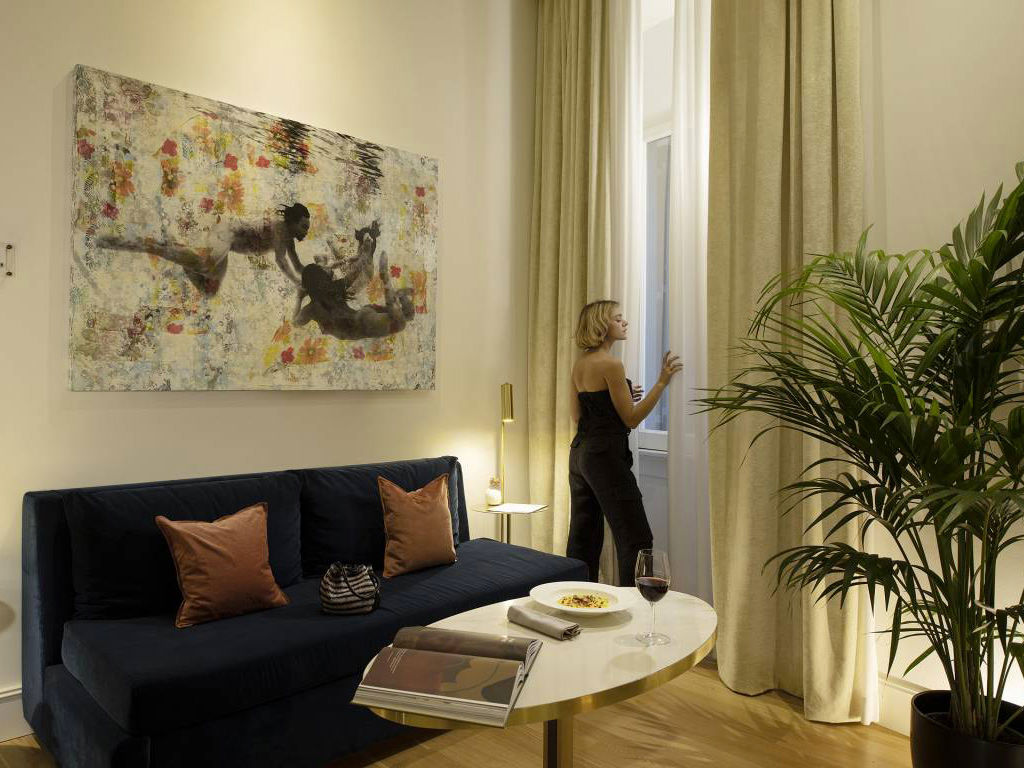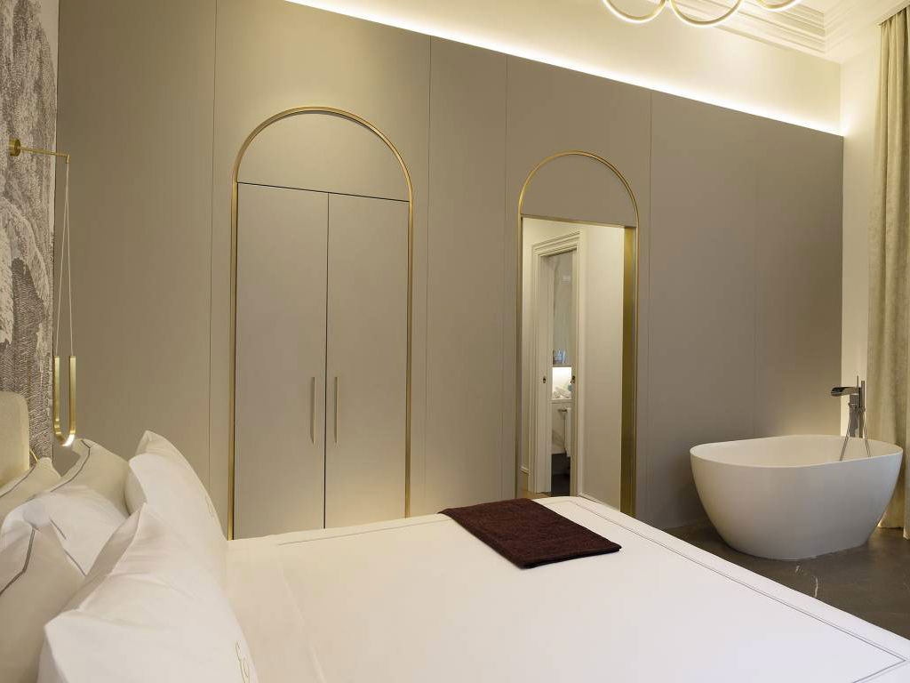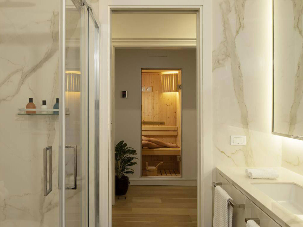 Original black-and-white wallpapers inspired by the epic “Grand Tours of Italy” are accompanied by an impeccable palette of natural tones and golden details. An arched entryway leads into the bedroom with king-size bed and to the spacious living room with a comfortable double sofa bed. Spa Suites grant guests the luxury of a private sauna and an in-room bathtub. The spa suites overlook Via del Corso.